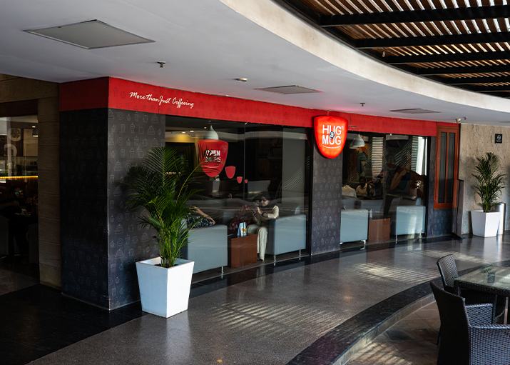 Hug a Mug cafe lounge spells class with comfortable sink-in sofas and a counter with wooden lining complete with tons of solitude. The interior walls are ornate with action packed images featuring the youth on the go to give an amiable feeling that whips up a good appetite. The lounge is an informal place for people to socialise and connect; a cosy corner for ideation and creativity.